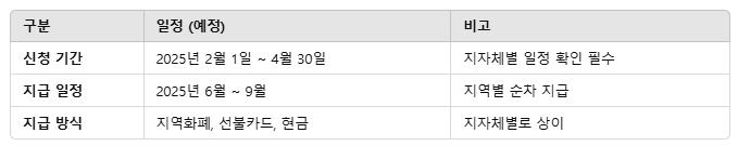 - 지급 방식 : 지역화폐, 농협 선불카드, 현금 중 택일 가능 (지자체별 상이)
