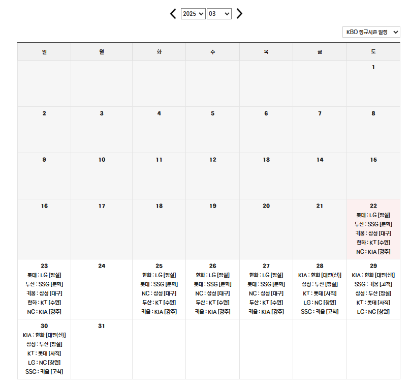 2025 KBO 리그가 시작되었습니다. 3월 22일 개막전, 어린이날 시리즈, 올스타전, 3연전 편성 등 전체 흐름을 한눈에 정리했습니다.빠르게 2025 KBO 일정을 원하시면 아래 버튼에서 확인하세요.